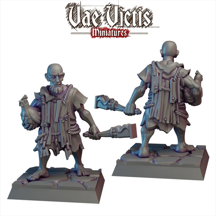 Old Man and Chicken Villager Miniature by Vae Victis: Dungeons & Dragons Resin Model - This miniature is a finely detailed collectible designed for tabletop RPG enthusiasts seeking immersive gameplay. This resin miniature captures the unique character of an old man and his chicken companion in the village, perfect for enhancing your Dungeons & Dragons campaigns or miniature collections. Available in both 28mm and 32mm scales, this figure offers precise sizing to match your existing models and terrain.